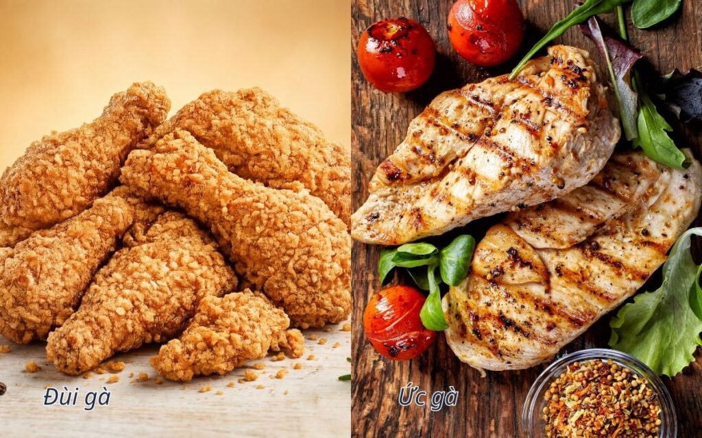 - Ức gà: Phần thịt trắng, ít béo, giàu protein, là lựa chọn lý tưởng cho người ăn kiêng. Bạn có thể làm ức gà áp chảo, xào rau củ, làm salad hoặc ruốc gà.