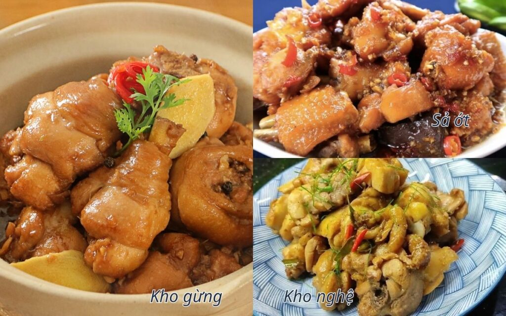 - Gà kho sả ớt: Sự kết hợp bùng nổ của sả thơm nồng và ớt cay xé lưỡi. Món này đặc biệt thích hợp cho những ai yêu thích vị đậm đà, kích thích vị giác.